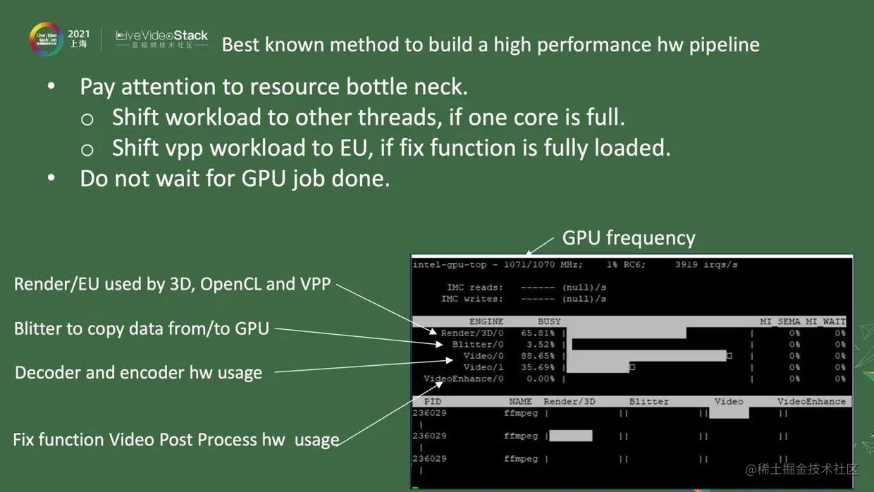 图中列出了一些工具,可以帮助大家观察GPU的状态。因为各种客户的应用场景不一样,有些客户会反映说,负载太低,或者fps太低,这时候就可以用开源工具来观察。针对Intel-GPU-Top,上面是GPU的频率,可能因为各种各样的原因,GPU的频率太低,不能达到要求。中间是引擎。第一个是Render引擎,包含了3D、OpenCL和vpp等,如果同时用3D和vpp操作,这个引擎的占用率就会很高。第二个是Blitter引擎,包含在CPU和GPU之间互相复制数据的操作,占用率一般不会很高。第三个引擎是Video,包含了decoder和encoder的硬件操作,尽量用满,硬件的功能才能完全发挥。第四个引擎是VideoEnhance,如果发现Render使用率过高,我们还提供了一个LowPower的方式,虽然质量稍低,但是可以做Video post process这些操作,把这些负载都移到这边,那么整体的负载就会均衡一些。像这张图一样,你会发现,任何引擎的使用率都不高,那就说明系统里有一些相互依赖的关系,要么去解决这些依赖关系,要么就多开一些实例把某一个引擎占满,那这个引擎就会成为你的系统瓶颈。