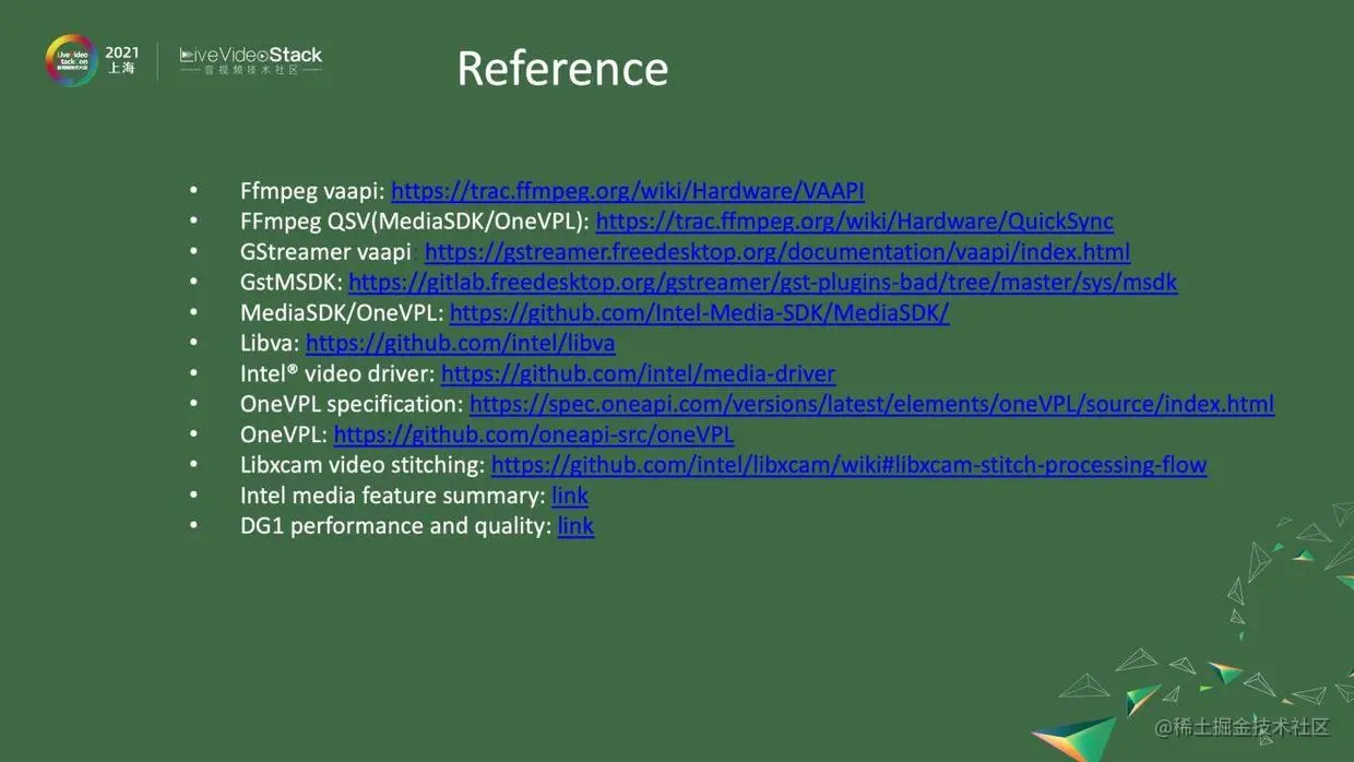 图中是对Intel在Linux上的媒体API的简单介绍,在介绍后面内容之前需要对此有个基本的了解。最下面是软件层,是video driver。在此之上,我们提供了一个叫VAAPI的接口,这就是Intel在Linux上面的硬件抽象层。基本上Linux系统都会有这个硬件抽象层,比如Android、Chrome上都有。但是,这个硬件抽象层,一般人会觉得非常复杂,因为需要做surface管理,最后要decode到slice 层,才能使用到这个API。所以,Intel又提供了另外一套API,就是oneVPL,你可以认为它就是以前的MediaSDK。这一层主要的接口就是,一帧的码流进去,然后一帧解码后的数据出来,因为它是基于VAAPI的二次开发,所以它能够提供更强大的编码参数,并做了一些跟硬件相关的质量调整,能够提供更高质量的编码码流。