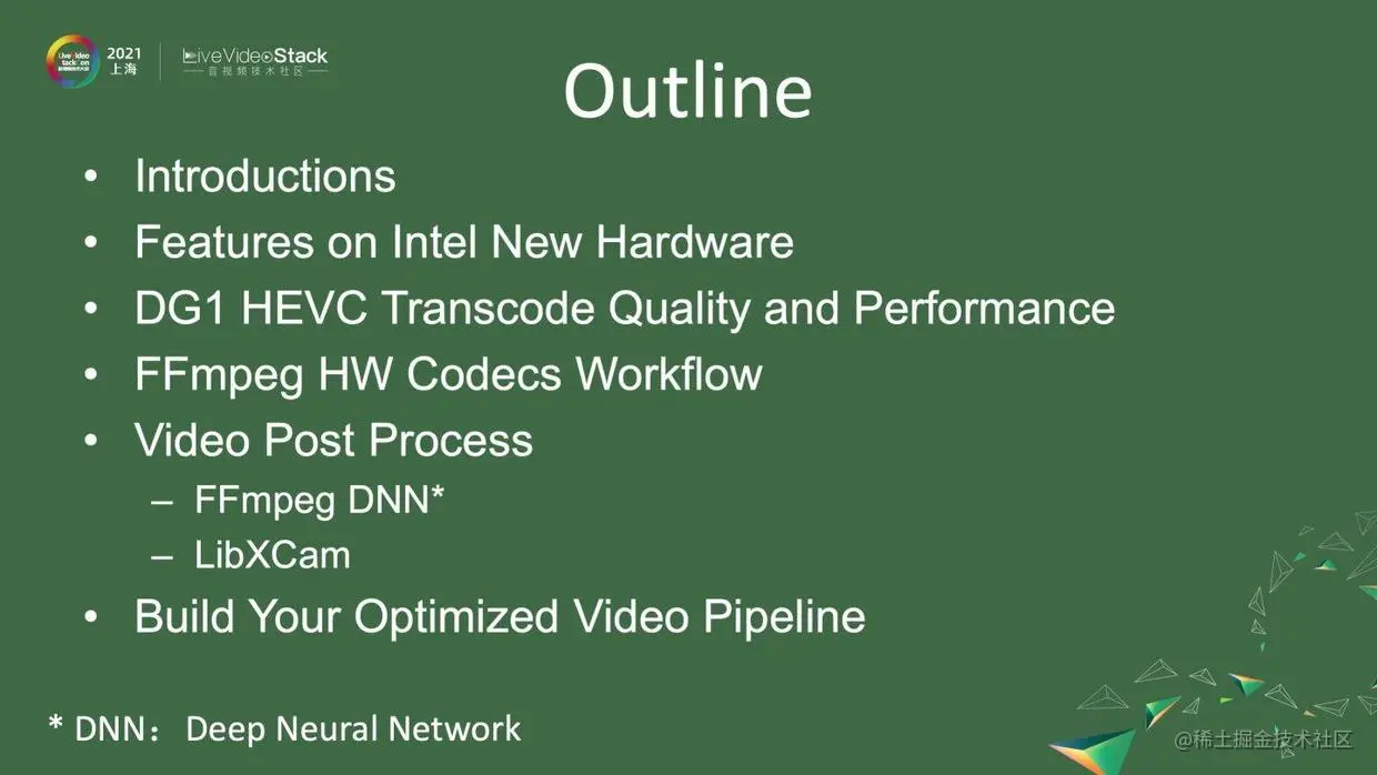 今天我们先给大家做一些基本的介绍,然后讨论Intel最新的硬件功能,第三,会让大家看一下Intel的独立显卡在HEVC的transcode的质量和性能。第四,我会简单介绍一下FFmpeg的hardwork codecs的工作流程。第五,介绍我们提供的两个Post Process,一个是FFmpeg DNN,一个是LibXCam。最后我会介绍如何在Intel的GPU上面,搭建一个优化的硬件视频pipeline,怎么发现硬件管线的问题。