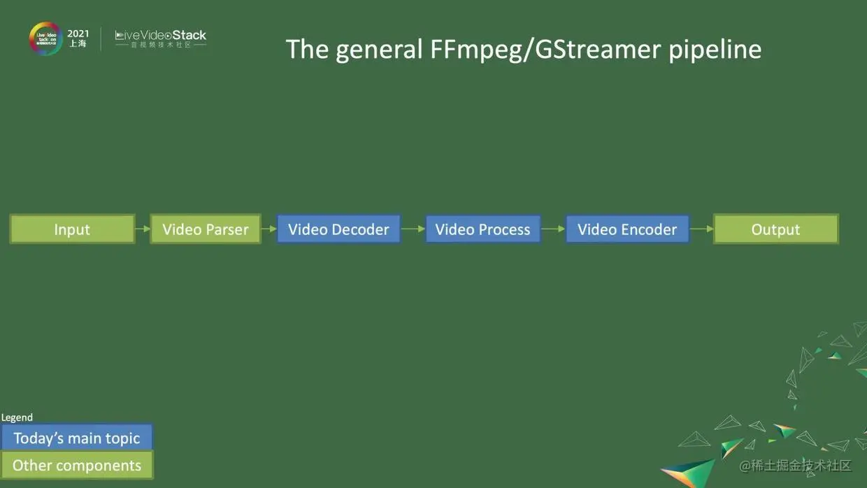 图中就是一个基本的FFmpeg/GStreamer的pipeline,一般会包括一个基本的输入、video parser、video decoder、video process、video encoder,以及最后的输出。今天我们会分享video parser和video codec的内容。