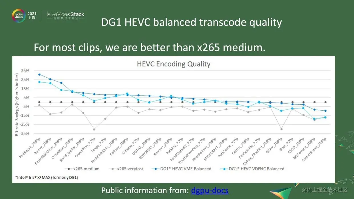 接下来,我们看看独立显卡DG1的transcode的质量。图中纵轴的原点是x265 medium,纵轴是bit-rate的节省,意思是比x265 medium好5%左右。横轴就是我们测的27个码流,在各个码流上DG1的表现。我们在DG1上提供了两种编码器。一种是VDENC,这其实是固定管线的、不可配置的,又把它叫作Low power模式,会节约电力。另一种是VME,是用处理单元去做一些事情,最后可以得到更好的码率。从这27个码流看来,码率基本上都会比x265 medium要好,有的会好到30%。