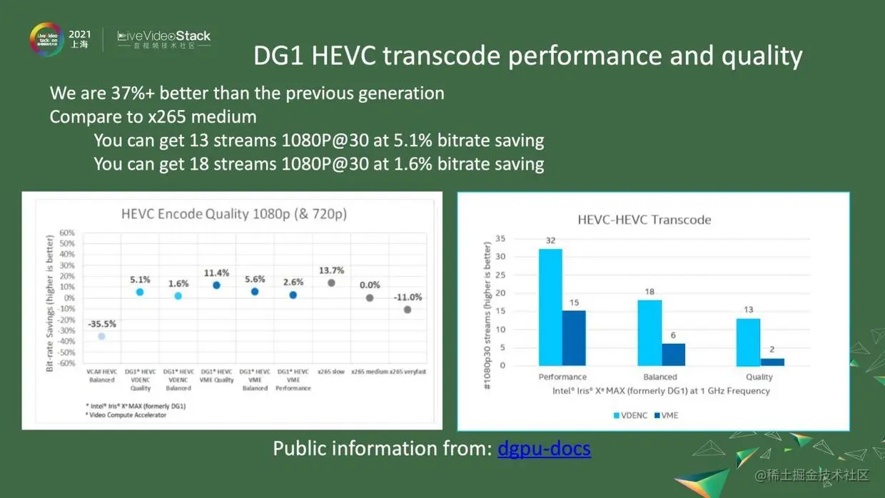 左图是对27个码流做了加权平均值,有很多点很有趣。第一个点是,前几代的产品,Intel以前卖过叫作VCA卡的产品。我们这一代的DG1相比VCA卡,最差的情况也会好37%以上,然后平均下来,所有的点都会比x265 medium都要好。第一个点是VDENC的high Quality模式,这个点上要比x265 medium要好5.1%左右。右图是transcode能到达的路数,即比x265 medium好5.1%的情况下,可以达到13路的1080p的30fps。如果你愿意牺牲2~3%的bit-rate的话,就使用Balanced模式,对应于第二个柱状图,大概能够达到18路的1080p的30fps。第一个柱状图是最好的,其实跟x265 slow差不多,大概差1、2点,在这个点上,可以达到2路的1080p的30fps。
