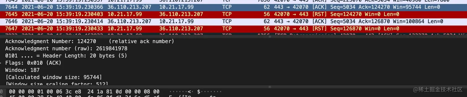 以第一行为例,它的 LEN=40,也就是 20 IP 头 + 20 字节 TCP 头,ACK 位被置位,表示这是一个没有任何内容的 ACK 包,对应于上图中 RST 包的前一个 ACK 包。这个包的详情如下图,window 等于 187 也是对的上的。