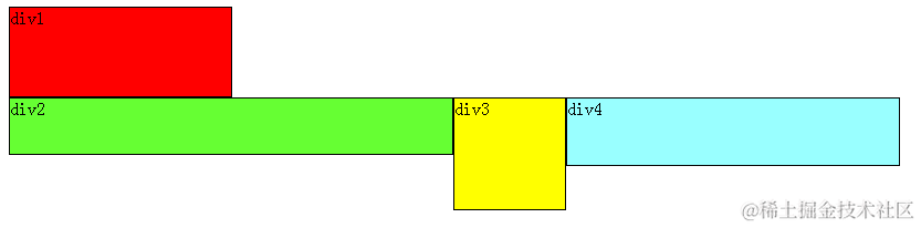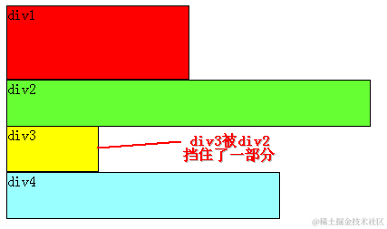 同理,由于div2、div3浮动,它们不再属于标准流,因此div4会自动上移,与div1组成一个“新”标准流,而浮动是漂浮在标准流之上,因此div2又挡住了div4。