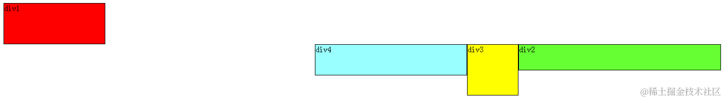 此时div2靠页面右边缘排列,不再遮挡div3,读者可以清晰的看到上面所讲的div1、div3、div4组成的流。