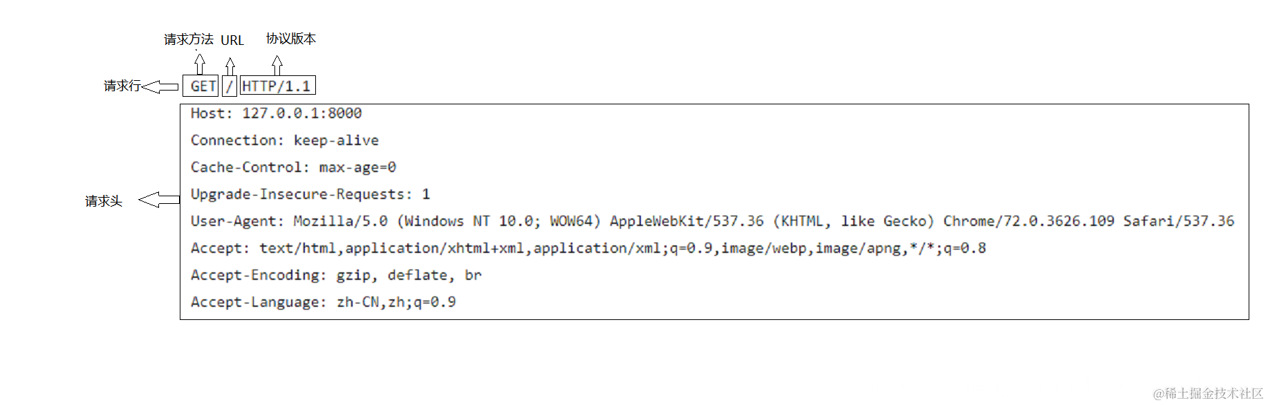 启动上面的HTTP Server,然后使用谷歌浏览器访问http://127.0.0.1:8000/,我们可以从浏览器的响应的内容(或者F12>Nettwork>Request Headers)知道我们实际请求的http报文