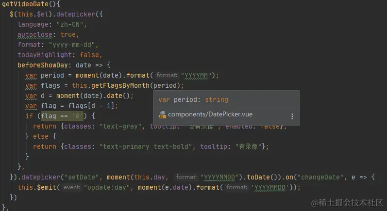 随后在mounted方法中再调用创建日期组件方法,声明组件的格式和语言。