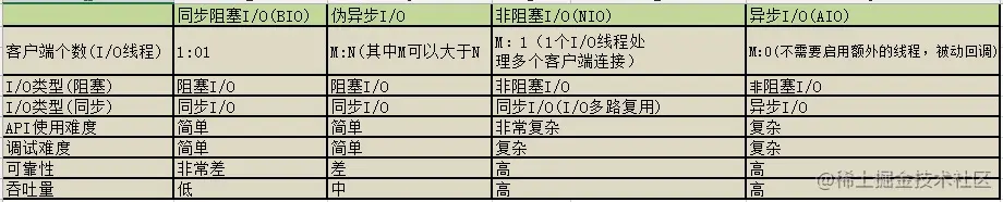 前面对不同的I/O模型进行了简单介绍,不同的I/O 模型由于线程模型、API 等差别很大,所以用法的差异也非常大。我们用一个表格来做一个统一说明: