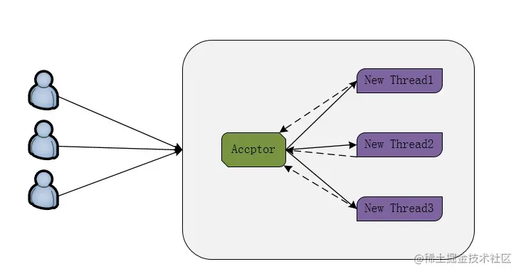 采用BIO通信模型的服务端,通常由一个独立的Acceptor线程负责监听客户端的连接,它接收到客户端连接请求之后为每个客户端创建一个新的线程进行链路处理,处理完成之后,通过输出流返回应答给客户端, 统程销毁。这就是典型的一请求一回答通信模型。
