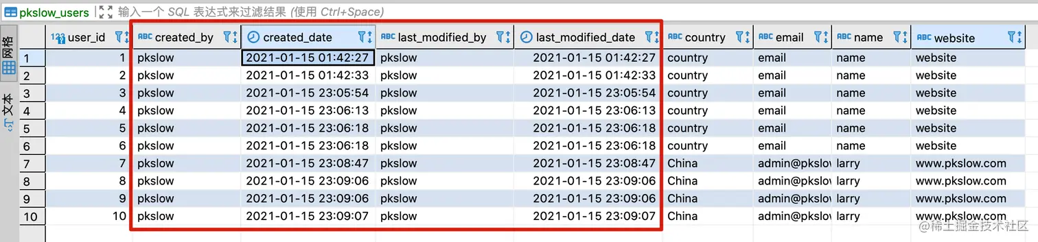 {"createdBy":"pkslow","createdDate":"2021-01-15T15:08:47.035+0000","lastModifiedBy":"pkslow","lastModifiedDate":"2021-01-15T15:08:47.035+0000","userId":7,"name":"larry","email":"admin@pkslow.com","country":"China","website":"www.pkslow.com"}