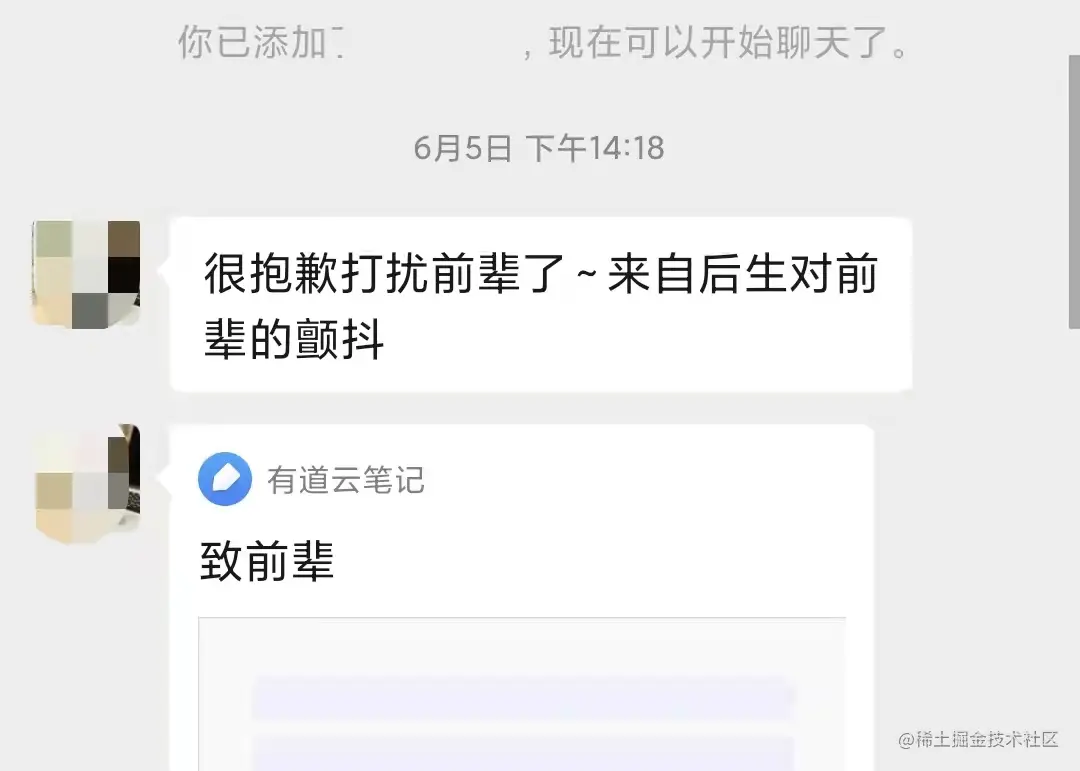 见下图,微信上收到读者发来了一篇有道云笔记《致前辈》。