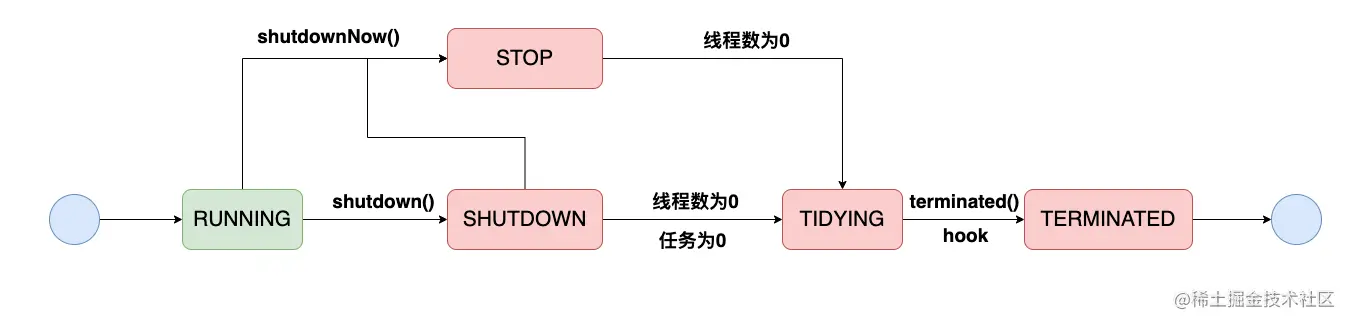 停止线程池可以使用shutdown()或者shutdownNow(),shutdown()可以继续处理队列中的任务,而shutdownNow()会立即清理任务,并返回未执行的任务。