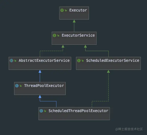 Executor 是顶级接口,里面只有一个方法execute(Runnable command),定义的是调度线程池来执行任务,它定义了线程池的基本规范,执行任务是它的天职。