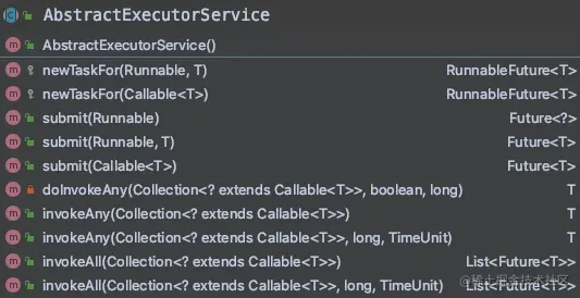 AbstractExecutorService 是一个抽象类,实现了 ExecutorService接口,这是大部分线程池的基本实现,定时的线程池先不关注,主要的方法如下: