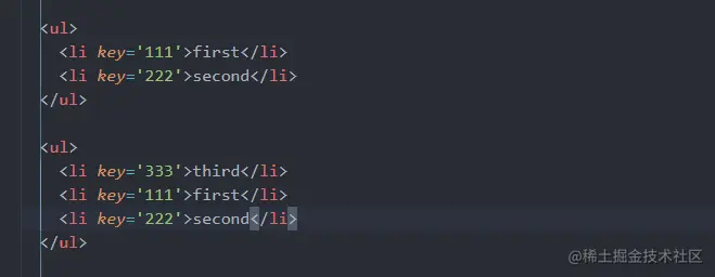 当子元素(这里的li)拥有 key 时,React 使用 key 来匹配原有树上的子元素以及最新树上的子元素: