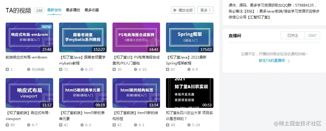 知了堂在B站上有诸多前段自学教程,需要的小伙伴们也可以自取。