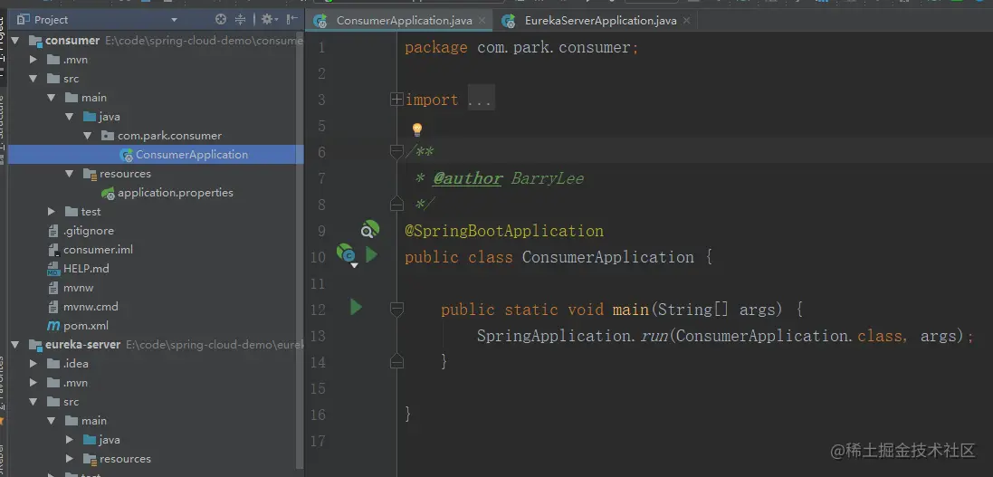 package com.park.consumer;import org.springframework.boot.SpringApplication;import org.springframework.boot.autoconfigure.SpringBootApplication;import org.springframework.cloud.netflix.eureka.EnableEurekaClient;/** * @author BarryLee */@EnableEurekaClient@SpringBootApplicationpublic class ConsumerApplication { public static void main(String[] args) { SpringApplication.run(ConsumerApplication.class, args); }}