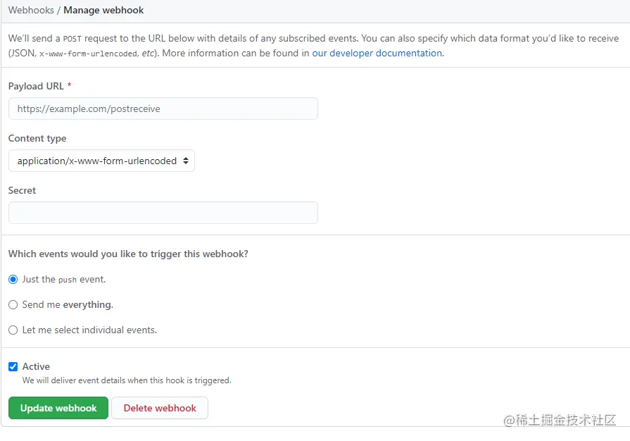 - Payload URL 填写的是刷新的地址,git 能访问的地址,如果是内网,那公司的 gitlab 仓库也能访问