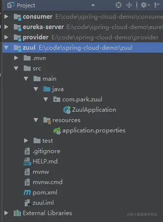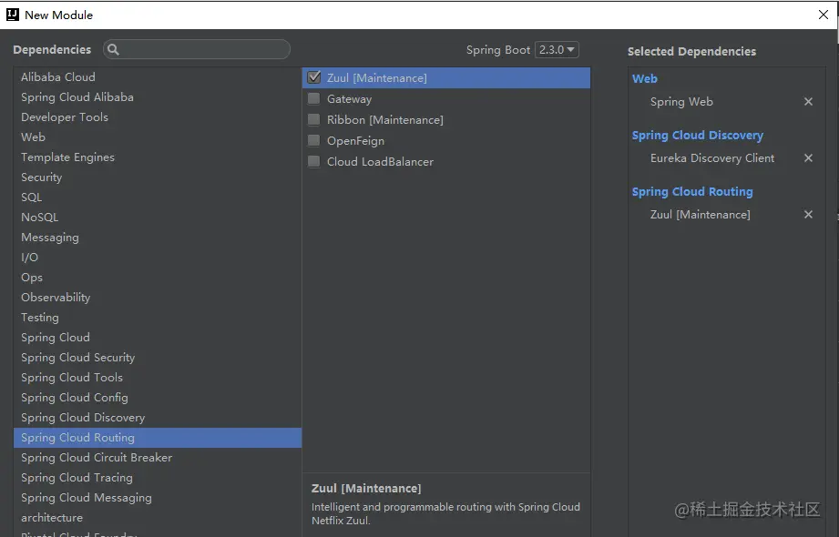 - 添加一个模块 zuul,组件选择:web, eureka client, zuul