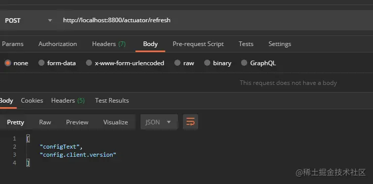 c. POST 请求:http://localhost:8800/actuator/bus-refresh ,再调用 testConfig