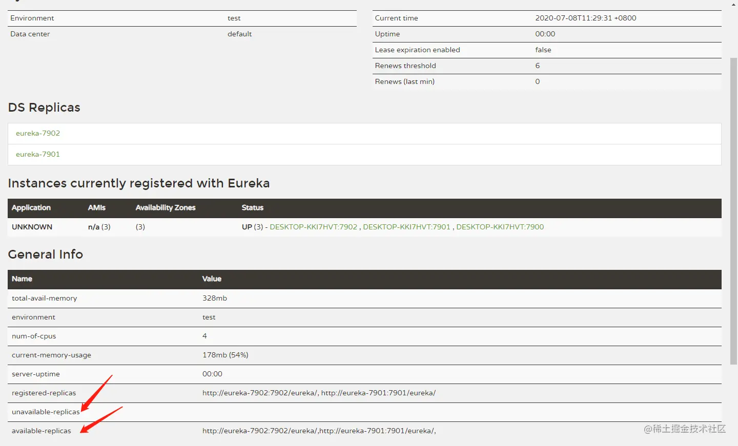 server: port: 7900eureka: client: #是否将自己注册到Eureka Server,默认为true,由于当前就是server,故而设置成false,表明该服务不会向eureka注册自己的信息 register-with-eureka: true #是否从eureka server获取注册信息,由于单节点,不需要同步其他节点数据,用false fetch-registry: true service-url: #设置服务注册中心的URL,用于client和server端交流 defaultZone: http://eureka-7901:7901/eureka/,http://eureka-7902:7902/eureka/ instance: #主机名,必填 hostname: eureka-7900