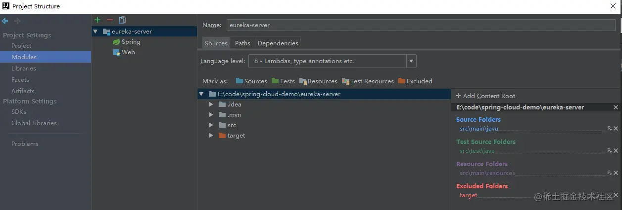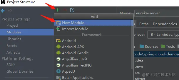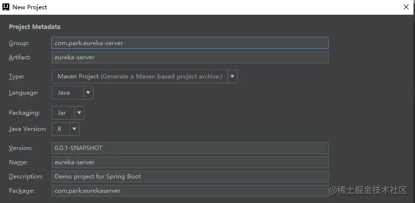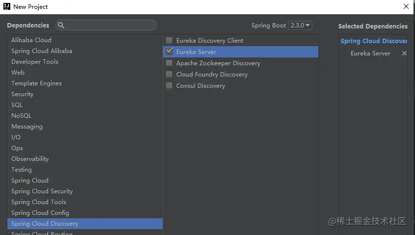 - 选择 Eureka Server 依赖,然后 Next 选择文件路径,确定,等待项目依赖加载完成