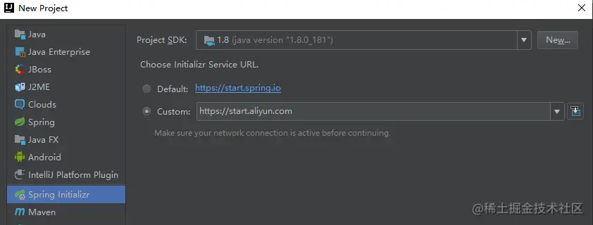 - File -> new -> project 新建项目,然后更换镜像:start.aliyun.com