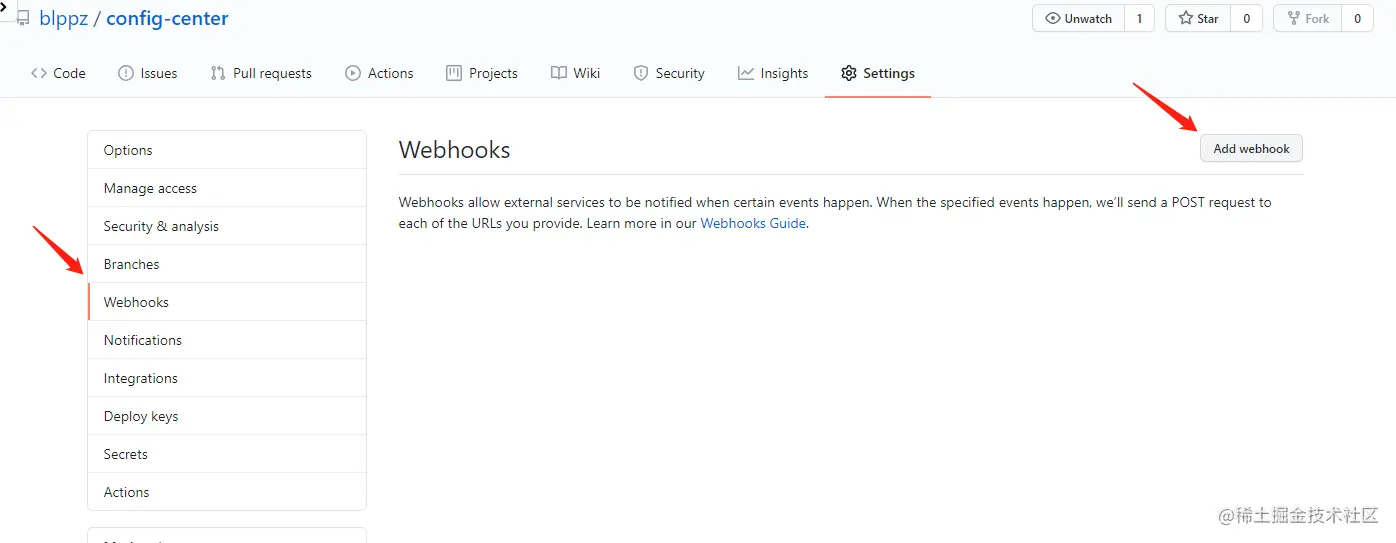 - 打开配置中心的 git 仓库,添加一个 webhooks