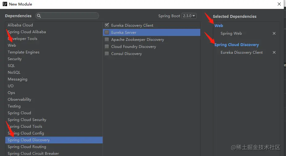 添加依赖 Spring Web 以及 Eureka Client,然后 Next 选择文件路径,确定,等待项目依赖加载完成