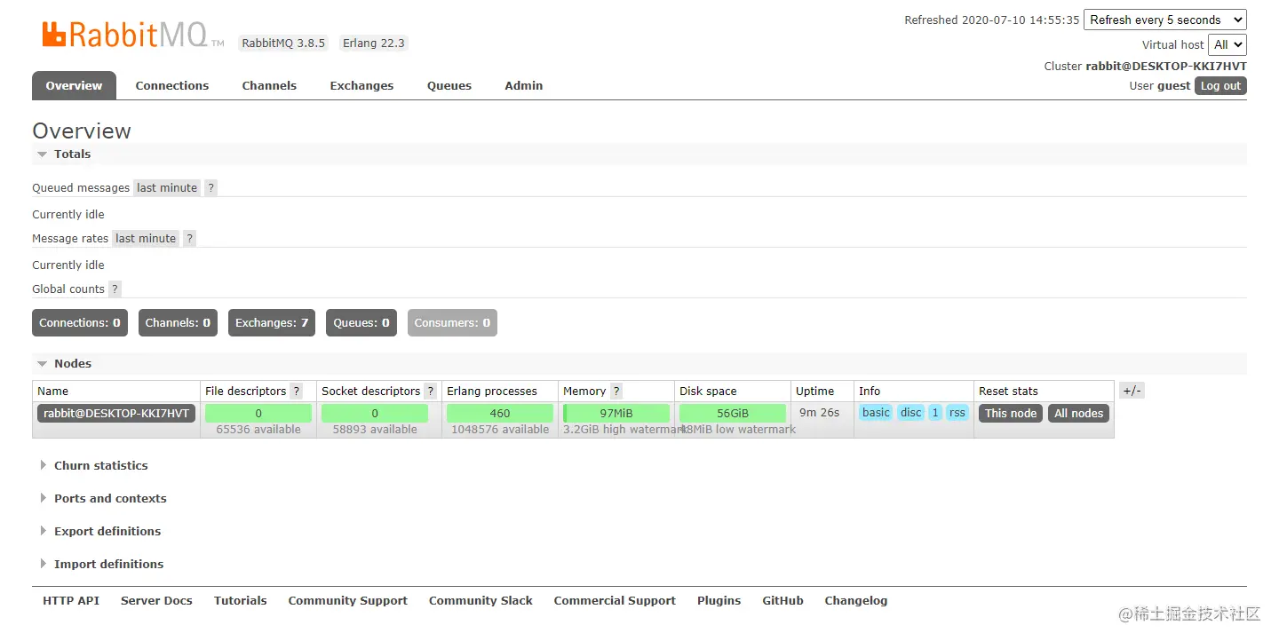 然后打开 http://localhost:15672/ ,用户名、密码都是 guest