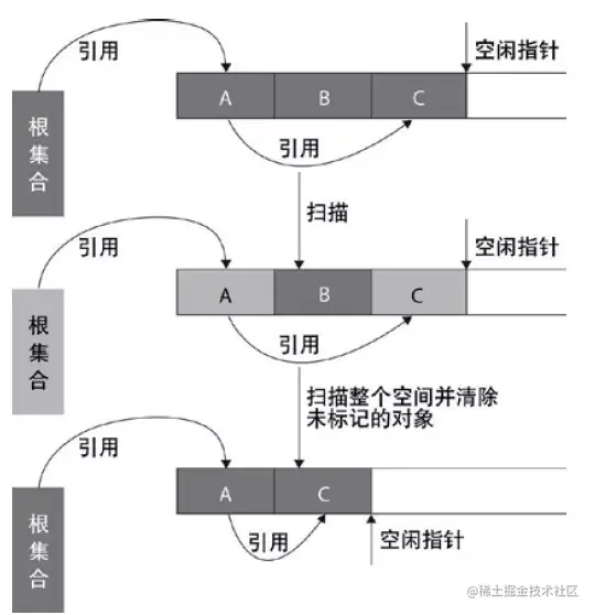 标记-清除算法采用从根集合(GC Roots)进行扫描,对存活的对象进行标记标记完毕后,再扫描整个空间中未被标记的对象,进行回收,如下图所示。标记-清除算法不需要进行对象的移动,只需对不存活的对象进行处理,在存活对象比较多的情况下极为高效但由于标记-清除算法直接回收不存活的对象,因此会造成内存碎片!![]
