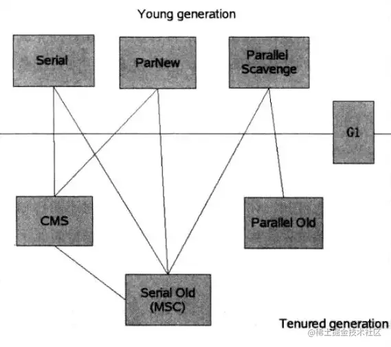 下面一张图是HotSpot虚拟机包含的所有收集器。