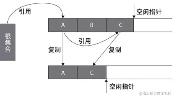复制算法的提出是为了克服句柄的开销和解决内存碎片的问题。它开始时把堆分成 一个对象面和多个空闲面, 程序从对象面为对象分配空间,当对象满了,基于copying算法的垃圾收集就从根集合(GC Roots)中扫描活动对象,并将每个活动对象复制到空闲面(使得活动对象所占的内存之间没有空闲洞)这样空闲面变成了对象面,原来的对象面变成了空闲面,程序会在新的对象面中分配内存。