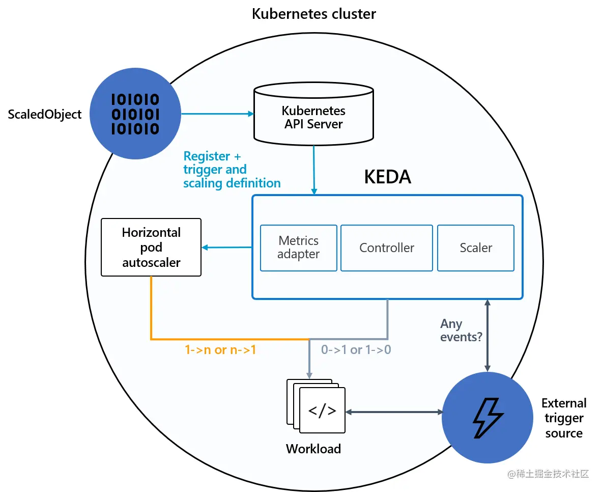 KEDA 是 Kubernetes 基于事件驱动的自动伸缩工具,通过 KEDA 我们可以根据需要处理的事件数量来驱动 Kubernetes 中任何容器的扩展。KEDA 可以直接部署到任何 Kubernetes 集群中和标准的组件一起工作。