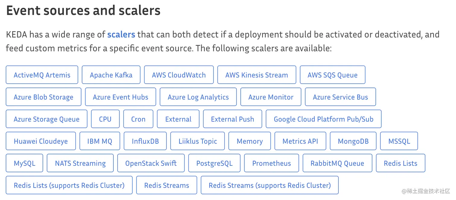 Kubernetes自带的HPA是只支持CPU/MEM的,很多时候我们并不根据这两项指标来进行伸缩资源。比如消费者不断处理MQ的消息,我们希望MQ如果堆积过多,就启动更多的消费者来处理任务。而Keda给了我们很多选择。