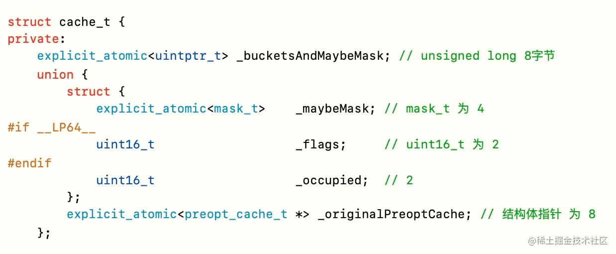 cache_t中的方法和static声明的字段都不是在该结构体内,所以只需要分析上面的有效代码,获取cache_t所占用的内存大小,即可得到bits的内存偏移量。
