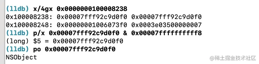 $ x/4gx obj地址:查看obj对象的isa及内存占用。