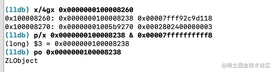 __86_64__的掩码地址0x00007ffffffffff8ULL,最终得到ZLObject的地址:0x0000000100008260