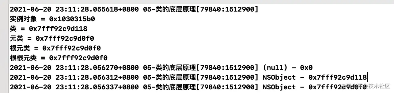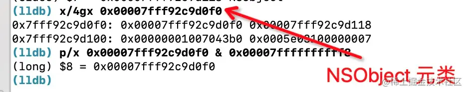 通过查看 NSObject.class 的内存地址 0x00007fff92c9d118,发现和之前的 NSObject 地址 0x00007fff92c9d0f0 不一样,因此 0x00007fff92c9d0f0 为 NSObject 的 元类。