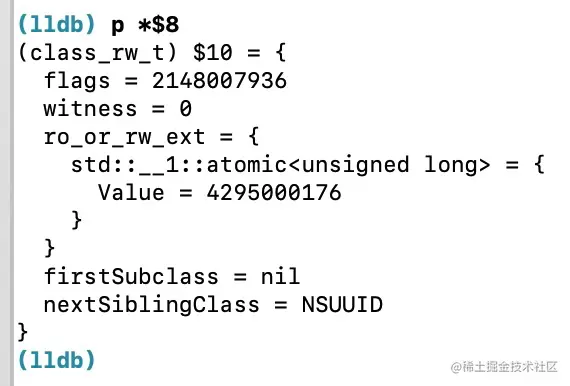 因此,可以通过 $4->data() 方法获取 class_rw_t 内存地址: