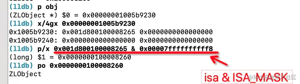 ZLObject的0x0000000100008260地址,再次进行isa和ISA_MASK与运算,最终得到0x0000000100008238的地址,还是ZLObject。