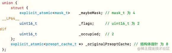 <preopt_cache_t *>为结构体指针,所以为8。联合体内部
