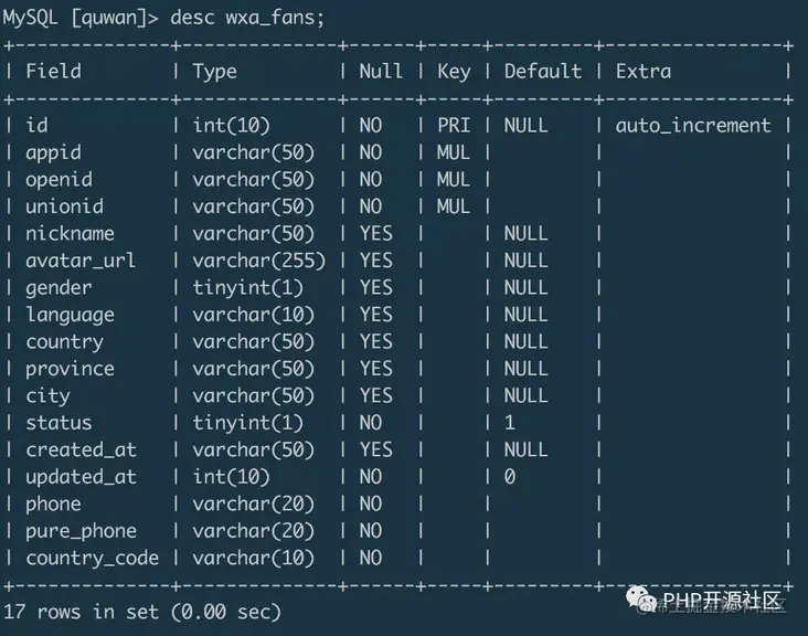 上面示例的从源数据库的dc_mp_fans表迁移数据到目标数据库的wxa_fans表,两个数据表的字段分别为: