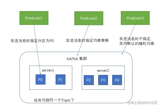 为了提高 Kafka 的吞吐量, Kafka 将同一主题下的事件进行分区(partition)存储, Kafka 会将同一主题下的多个分区均匀的分布到集群内的各个 broker 上. 一个分区可以理解成 broker 里的一个文件夹, 一个分区内的事件会按发送顺序存储. 这样可以用多个消费者同时消费一个主题下的多个分区.