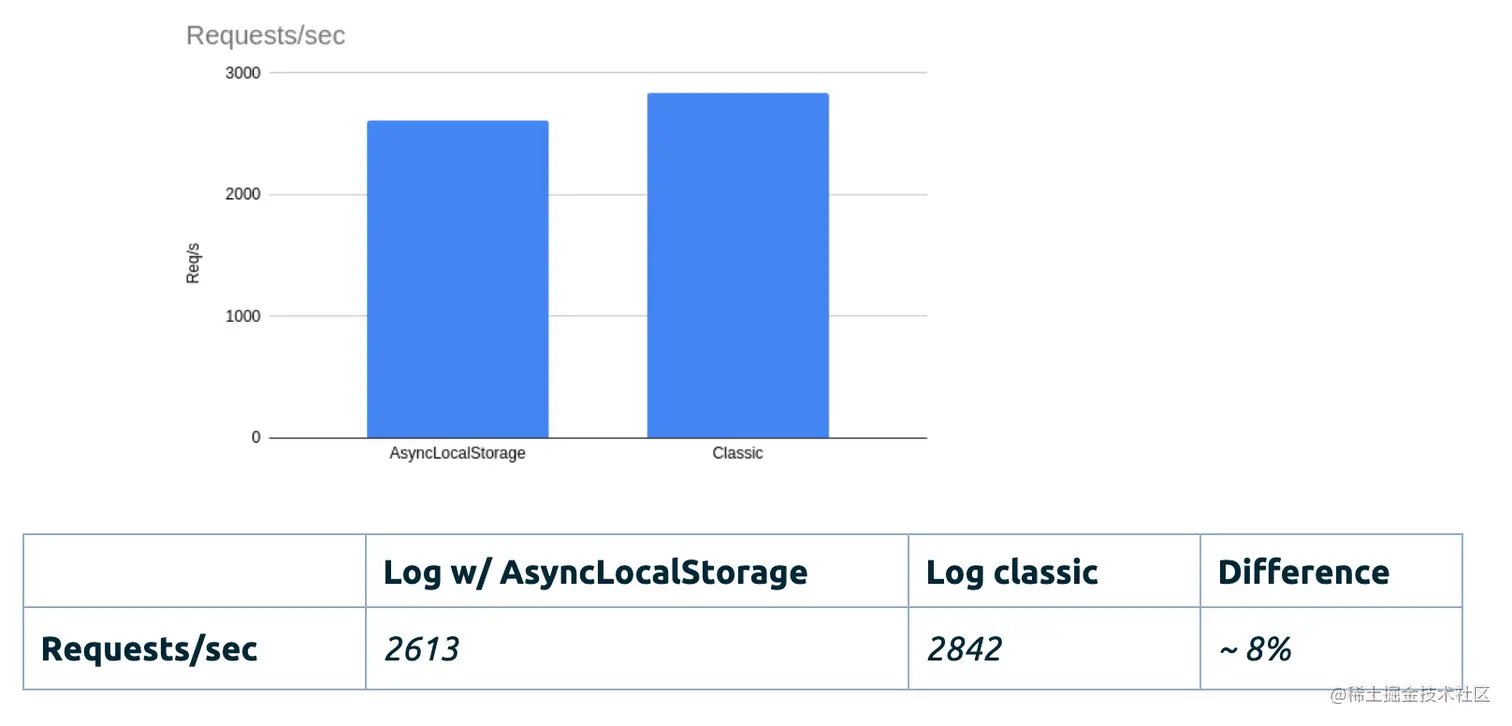 Kuzzle的性能基准测试,使用了 AsyncLocalStorage 与未使用之间相差 ~ 8%社区也有相关 issue 跟踪 als 的性能问题:AsyncLocalStorage kills 97% of performance in an