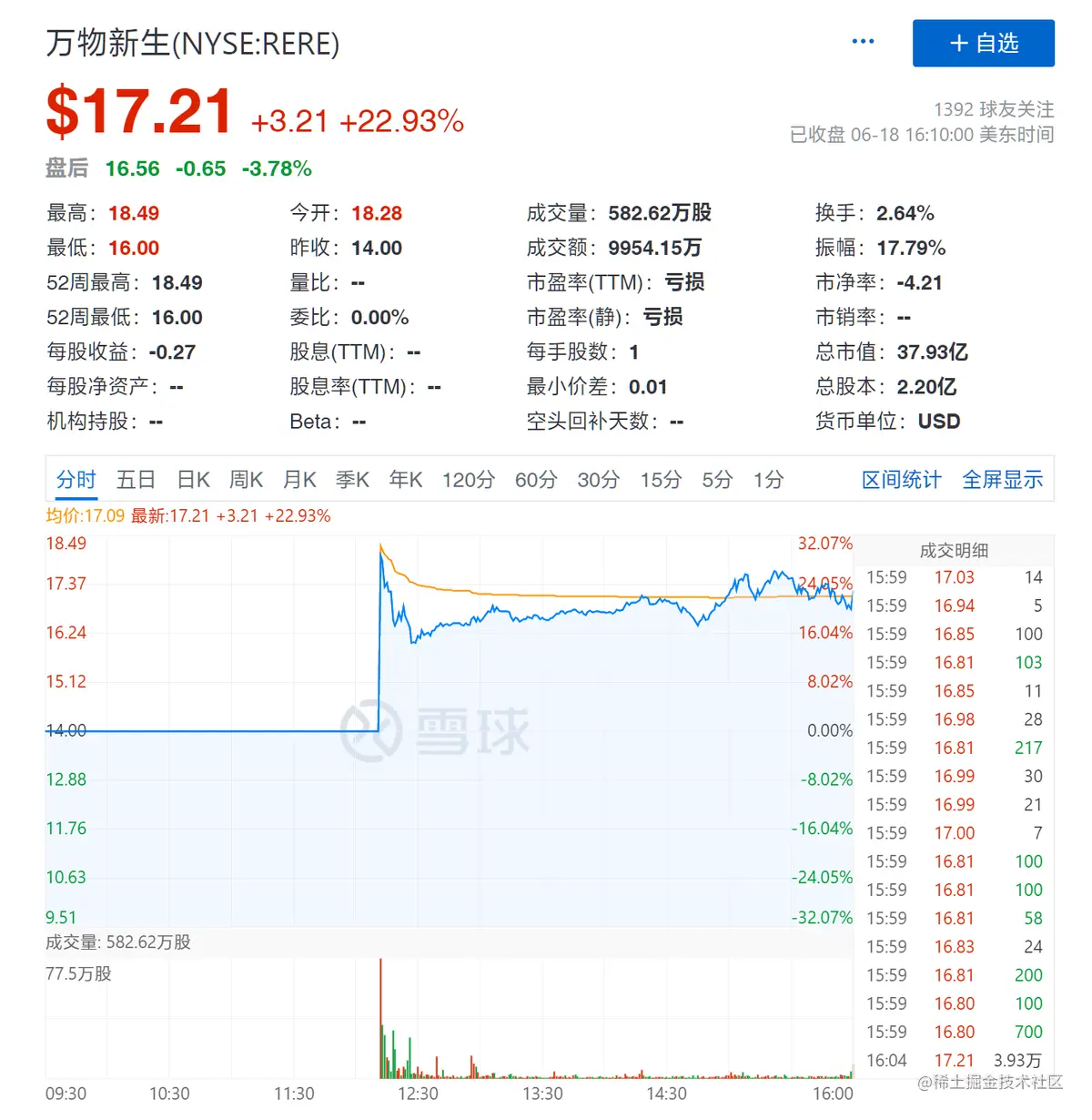北京时间6月18日晚,二手消费电子产品交易和服务平台万物新生集团——爱回收品牌母公司正式在纽交所敲钟上市,成为中国二手交易市场里,登陆资本市场的头号玩家。其发行价定为14美元,上市首日,万物新生盘中最高涨幅达32%,最终收涨22.93%,目前总市值37.93亿美元,坐实中概股ESG第一股的称号。
