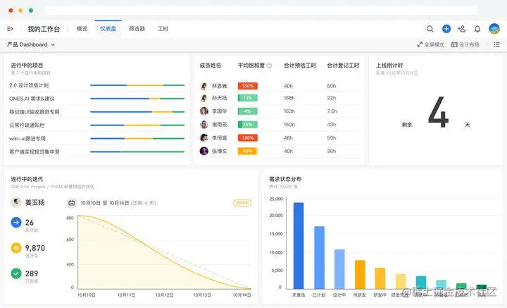 在ONES 仪表盘和概览中,管理者还可以设置自定义的多维度的卡片和报表,聚焦最关注项目核心数据,随时掌控项目进度,提升了团队的风险应对能力。