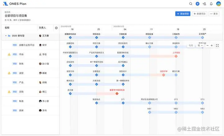 ONES Plan 项目集管理,将多个项目汇总到一处,为管理者提供全局视角管控多项目进度。管理者也可以重点关注某个车辆研发项目,了解该项目下的子项目详情,如查看项目周期、任务负责人、任务数量以及每个任务的进展情况。