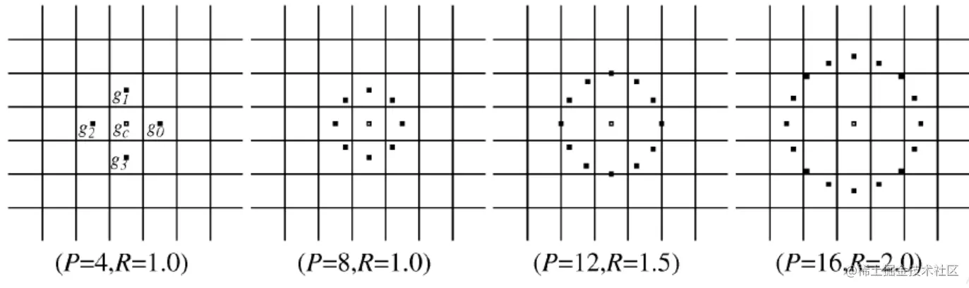 改进:圆形LBP算子: 为了适应不同尺度的纹理特征,并达到灰度和旋转不变性的要求,Ojala等对 LBP 算子进行了改进,将 3×3邻域扩展到任意邻域,并用圆形邻域代替了正方形邻域,改进后的 LBP 算子允许在半径为 R 的圆形邻域内有任意多个像素点。