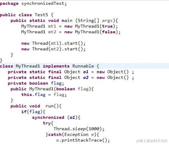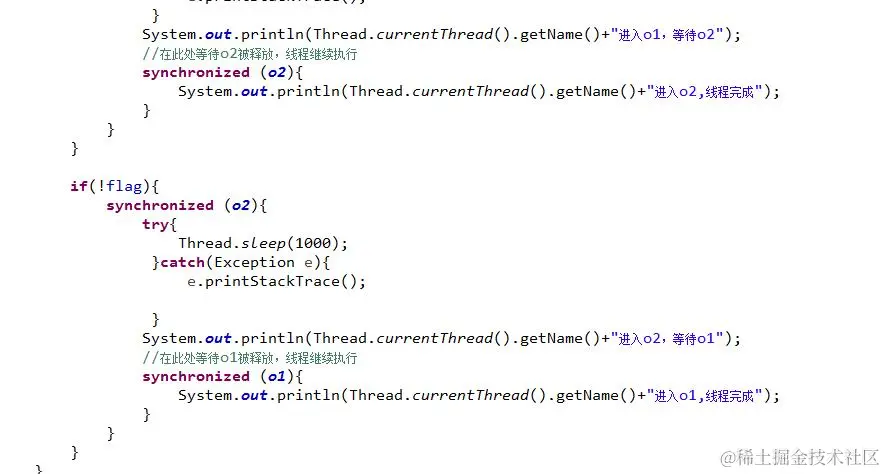 线程死锁 宝哥大数据 2021-06-22 212 阅读1分钟 运行的结果: 死锁的原因:因为线程1,2要同时使用o1,o2两个资源, 但是线程1抱着o1的锁不放,等待o2的锁被被释放; 而线程2抱着o2的锁不放,等待o1的锁被释放。 两者都想要对方的被锁住的资源,却不放自己所有的锁,最终两人都无法执行下去,形成死锁